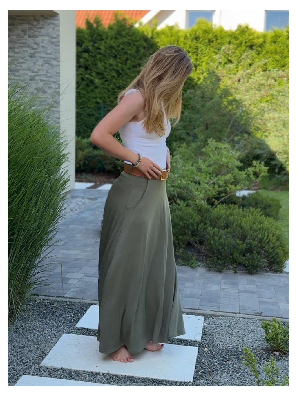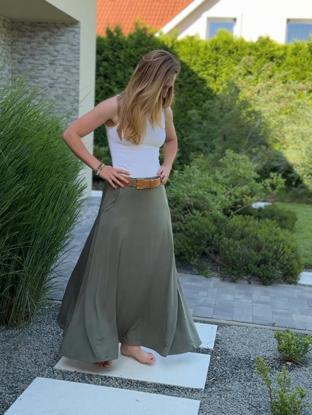 Praktické kapsy dodávají sukni funkčnost, zatímco kolový střih vytváří lehký a vzdušný vzhled.